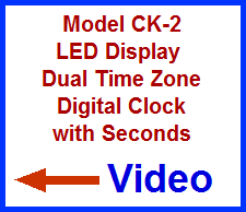 The CK-2 LED Digital Dual Time Zone Clock conveniently and reliably displays time in any two time zones! Its highly readable, unique, and attractive LED illuminated display shows separate Hours (in two time zones), Minutes, and Seconds. The CK-2 is essentially two clocks which are set up for synchronous operation. Both clocks track each other perfectly, second after second. Let the CK-2 take the guesswork and confusion out of tracking any two time zones. It makes national and international timekeeping easy and effortless! |